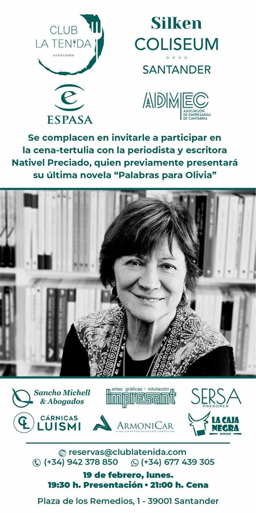 Cena-tertulia junto a la reconocida periodista y escritora, Nativel Preciado + Añadir Google Calendar Exportación + iCal / Outlook Fecha Feb 19 2024 Finalizdo! Hora 19:30 - 19:30 Coste 40.00 Localización Club La Tenida de Santander Calle del medio, Santander Web https://clublatenida.com/ Organizador ADMEC Compartir este evento